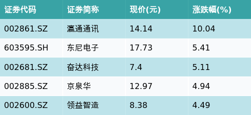 截至午间收盘,无线充电主题涨跌幅最高的五只股票为:瀛通通讯(002861.SZ)、东尼电子(603595.SH)、奋达科技(002681.SZ)、京泉华(002885.SZ)与领益智造(002600.SZ)。详情见下表: